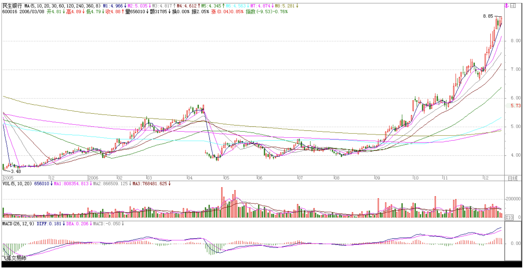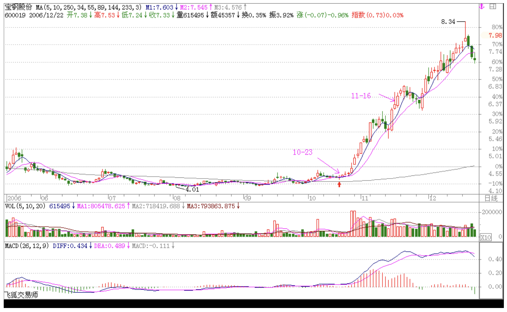 What if you've missed this rhythm? If your tape-reading skills are decent, you should enter strong stocks during pullbacks. Retail investors fear drops, but in a bull market, drops are like daddy coming home — every drop means daddy's here again, about to hand out money. If your tape-reading skills aren't up to par, there's one approach that's the simplest: watch for all new stocks that break above their first-day-of-listing highs on increased volume, and old stocks that break above their annual moving average on volume then pull back to it on reduced volume — these are the future dark horses. Pay particular attention to stocks whose annual moving average has flattened and then turned upward at an inflection point. As for stocks still below their annual moving average, don't bother — wait until they get above it. Actually, this is the simplest and most reliable method for finding so-called bull-market stocks. Let me give an example: look at Baosteel. After breaking through the annual moving average and pulling back on reduced volume, it pulled back to 4.20 yuan on October 23rd, when the annual moving average was at 4.17 yuan. Then it launched again on increased volume. Today, November 16th, it's already above 6 yuan — a 50% gain, just like that. Launching from the annual moving average for an initial 50% gain — isn't that like child's play? This ID generally only watches large-cap stocks since small-cap stocks are hard to get into with large positions, but retail investors can watch small-cap stocks — the principle is the same. However, with small-cap stocks, you need to be careful: large-cap stock breakouts usually have fewer fakeouts, but that's not necessarily the case with small-cap stocks, so you need to study this carefully yourself. Retail investors should just be good retail investors. Stop dreaming about catching bottoms and escaping tops every day. If you caught all the bottoms and escaped all the tops, what would the non-retail players eat? Retail investors must wait until the trend is clearly established before entering or exiting — this will save a lot of detours.