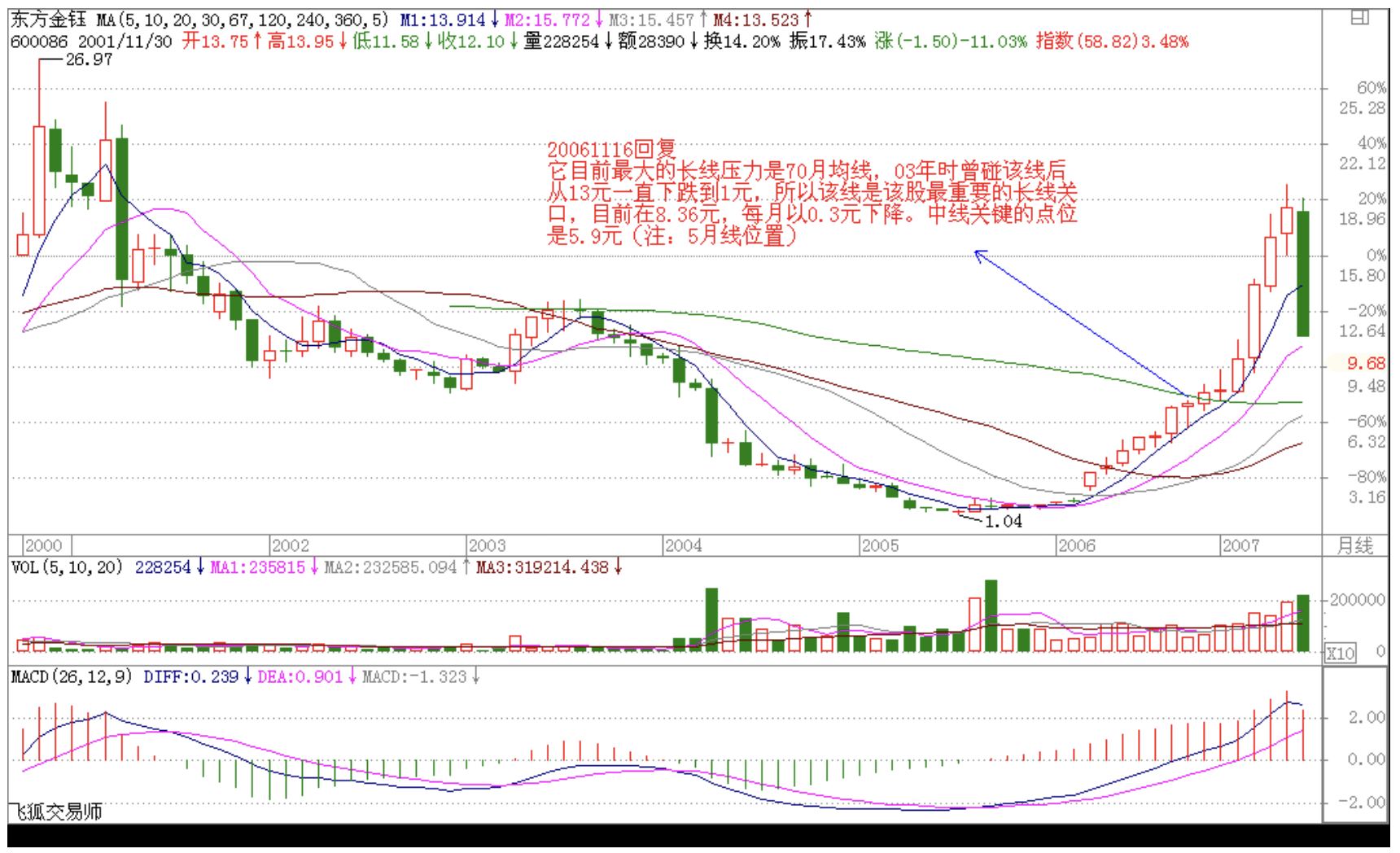 As for 600086 that you mentioned, it's already risen a lot — it pulled 8 consecutive months of bullish candles going from a little over 1 yuan to over 7 yuan, so a correction is perfectly normal. The key is your entry price. If you bought recently, you need to be prepared to weather the correction risk ahead. This ID can only tell you its current specific situation: its biggest long-term resistance is the 70-month moving average. In 2003, it touched that line and then fell from 13 yuan all the way to 1 yuan, so that line is the stock's most important long-term barrier, currently at 8.36 yuan, declining by 0.3 yuan per month. The mid-term key level is 5.9 yuan — if that level is effectively broken, the correction could be very deep. Currently, it can be viewed as box consolidation between 5.9 yuan and 7.2 yuan, and you can do short-term operations based on the box pattern — the so-called sell high, buy back low approach. Mid-term, wait for the breakout direction to be chosen.
