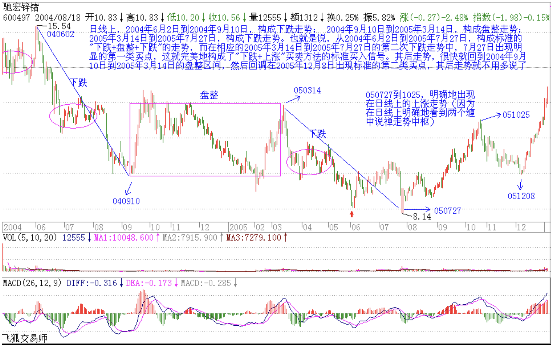 Chiho-Tiande (驰宏锌锗): On the daily chart, June 2, 2004 to September 10, 2004 constituted a downtrend; September 10, 2004 to March 14, 2005 constituted consolidation; March 14, 2005 to July 27, 2005 constituted a downtrend. That is, from June 2, 2004 to July 27, 2005, a standard "downtrend + consolidation + downtrend" pattern formed. In the second downward leg from March 14, 2005 to July 27, 2005, an obvious first-type buy point appeared on July 27—this perfectly constituted a standard buy signal for the "downtrend + uptrend" method. The subsequent movement quickly returned to the consolidation range of September 10, 2004 to March 14, 2005, then the pullback produced a standard second-type buy point on December 8, 2005. The subsequent movement goes without saying.