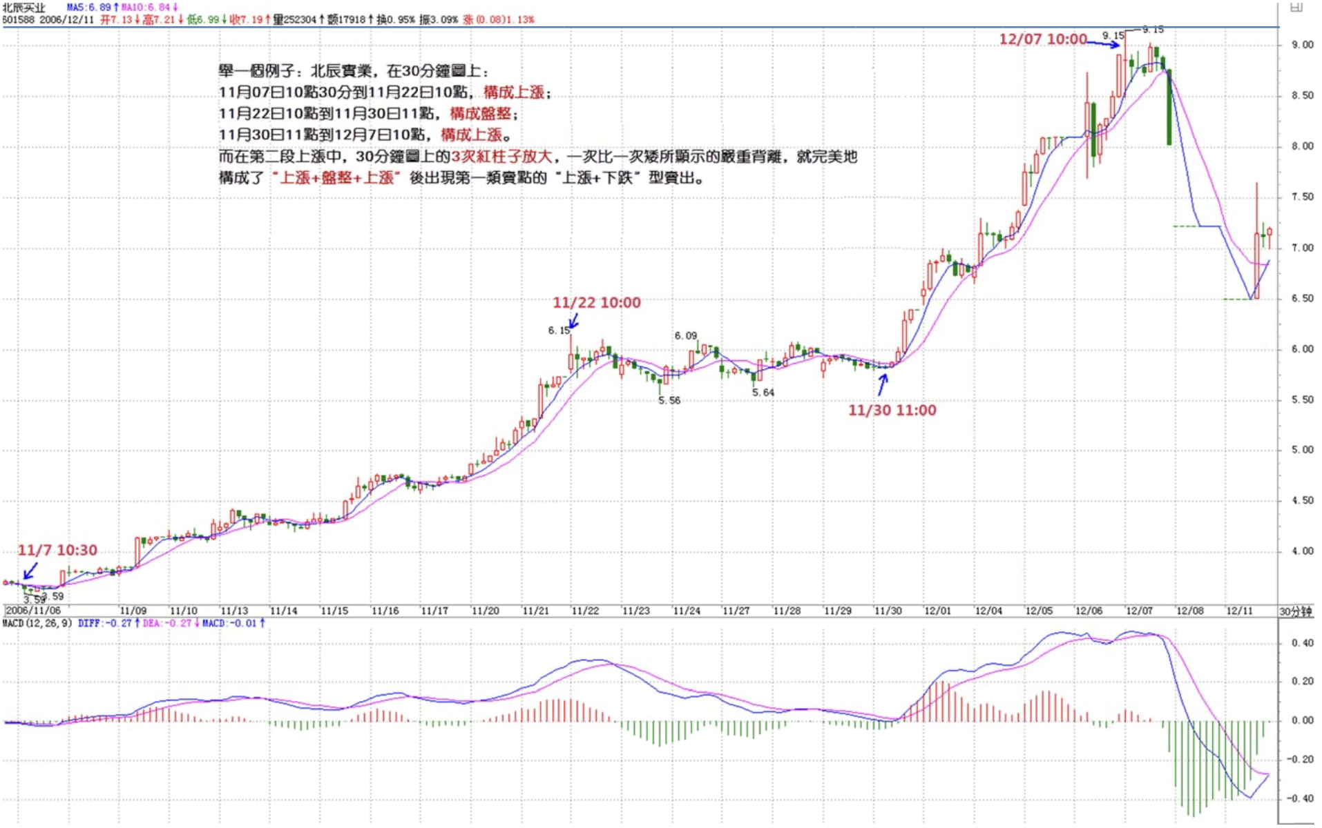 This method, reversed, also works well for selecting sell points. That is, when an "uptrend + consolidation + uptrend" pattern has preceded, once a first-type sell point appears in the second upward leg, you must exit, because what follows is very likely the classic "uptrend + downtrend" pattern. Here's another example: Beichen Real Estate—on the 30-minute chart, 10:30 AM November 7 to 10:00 AM November 22 constituted an uptrend; 10:00 AM November 22 to 11:00 AM November 30 constituted consolidation; 11:00 AM November 30 to 10:00 AM December 7 constituted an uptrend. In the second upward leg, the three red bar expansions on the 30-minute MACD chart, each getting shorter than the last—showing severe divergence—perfectly constituted a first-type sell point after "uptrend + consolidation + uptrend," triggering an "uptrend + downtrend" sell. If you later learn the concept of time windows, you'll have an even better grasp of this stock's sell point. Did you notice the relationship between 10:30 AM November 7 and 10:00 AM December 7?