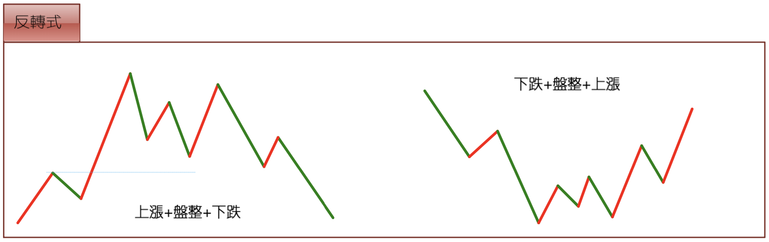 Reversal type: uptrend + consolidation + downtrend; downtrend + consolidation + uptrend.