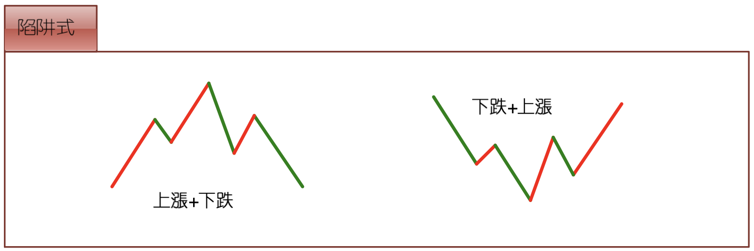 Trap type: uptrend + downtrend; downtrend + uptrend.