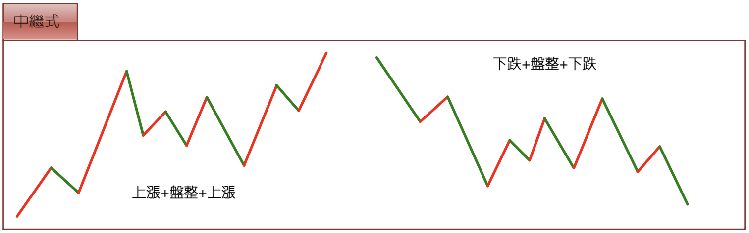 Continuation type: uptrend + consolidation + uptrend; downtrend + consolidation + downtrend.