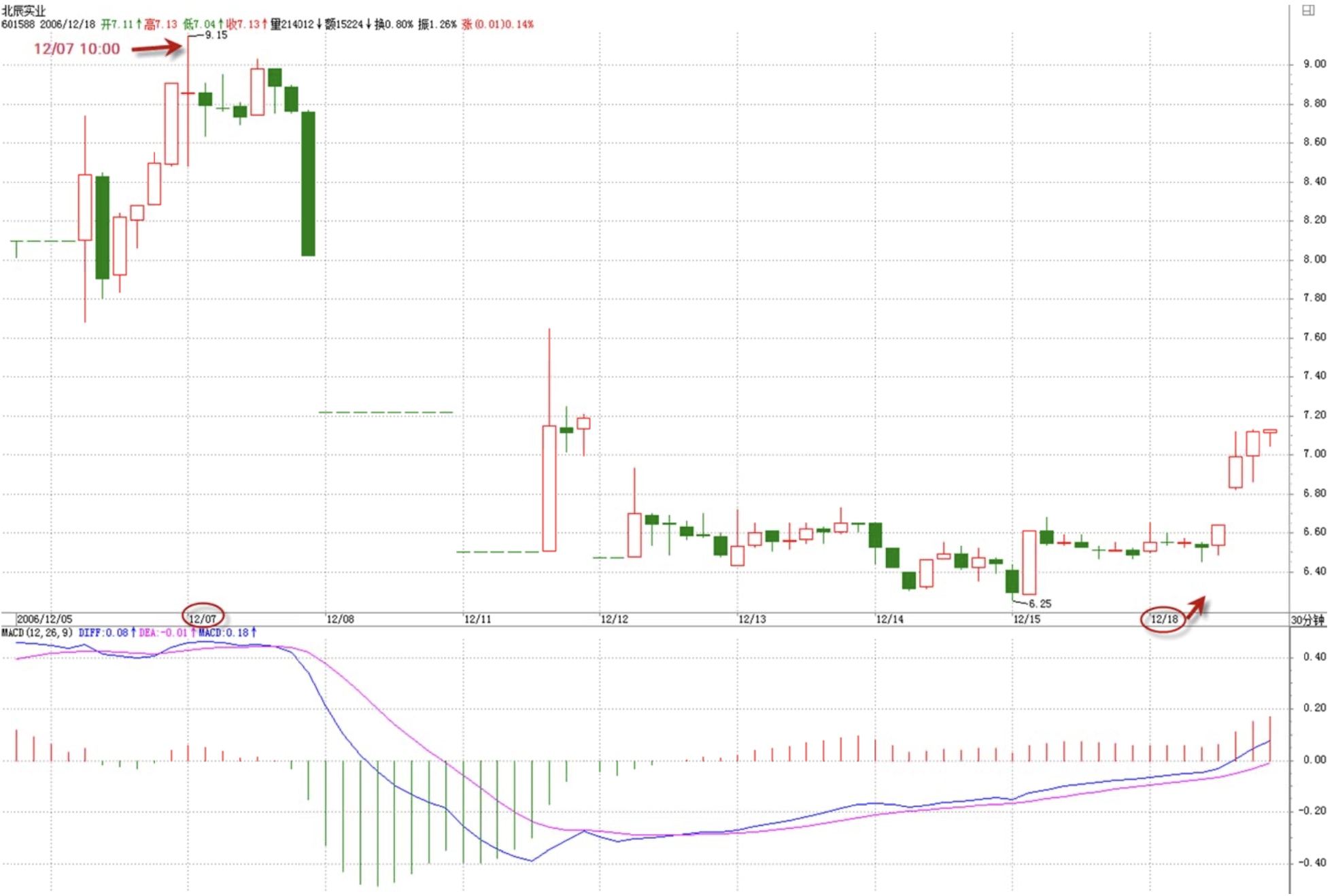 From the 30-minute chart: Dec 7 to Dec 12 is a downtrend, Dec 12 to Dec 18 13:00 is consolidation, this afternoon an uptrend; a "downtrend + consolidation + uptrend."