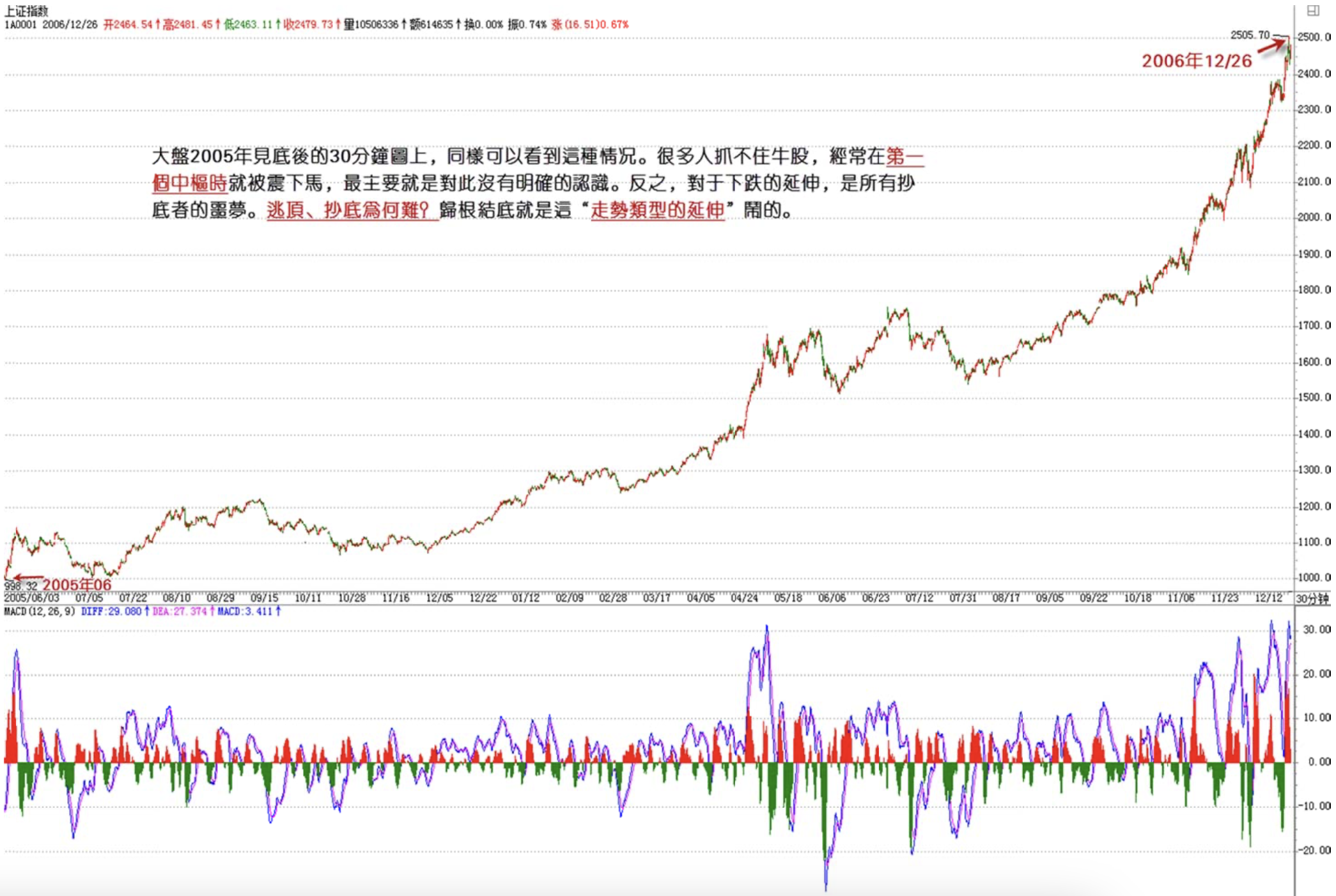 Similarly, with trends, after forming two sequential same-direction Chan Movement Hubs, any trend can end and be complete at any time—but it can also extend indefinitely, forming more hubs. This happens all the time in practice. If the trend is upward, it keeps rising. Look at 600519 and similar charts—with ex-rights factored in, you'll see a standard continuously extending uptrend. On the 30-minute chart from the 2005 market bottom onwards, the same thing is clearly visible. Many people can't hold on to winning stocks and often get shaken off at the first hub—mainly because they lack clear understanding of this. Conversely, the extension of a downtrend is every bottom-picker's nightmare. Why is it so hard to catch tops and bottoms? Fundamentally, it's all because of this "movement type extension."