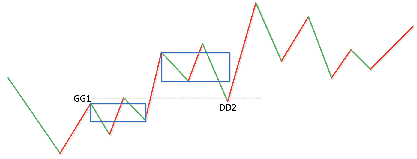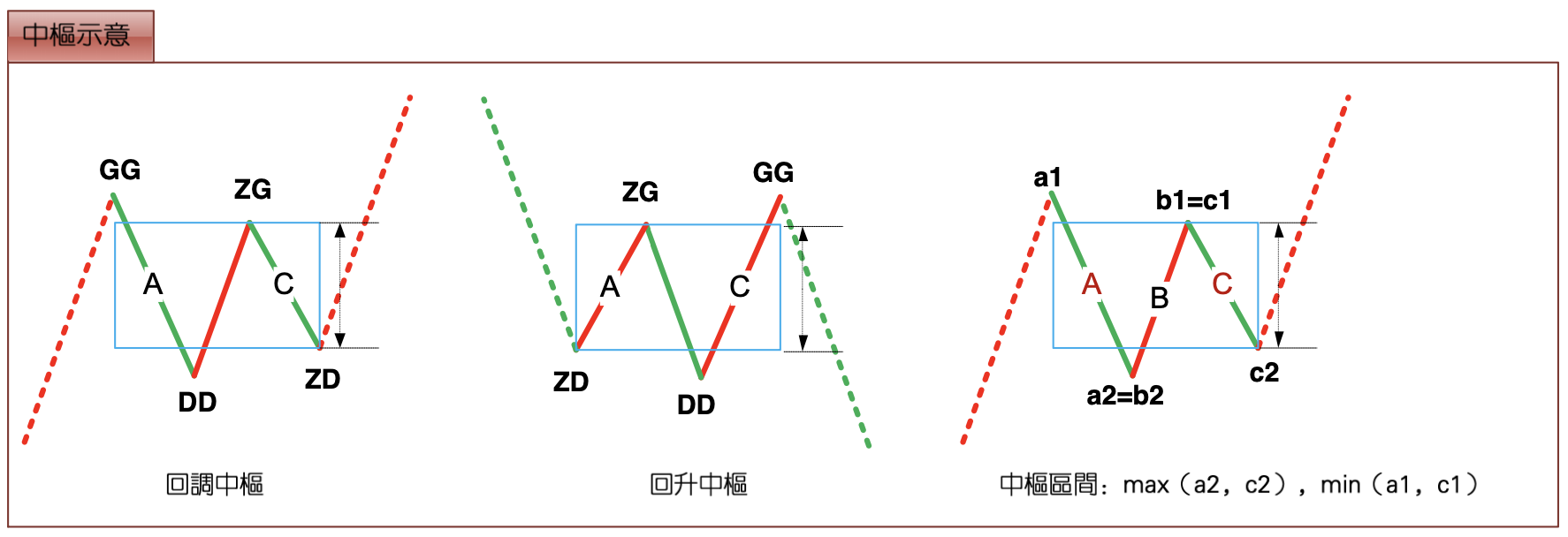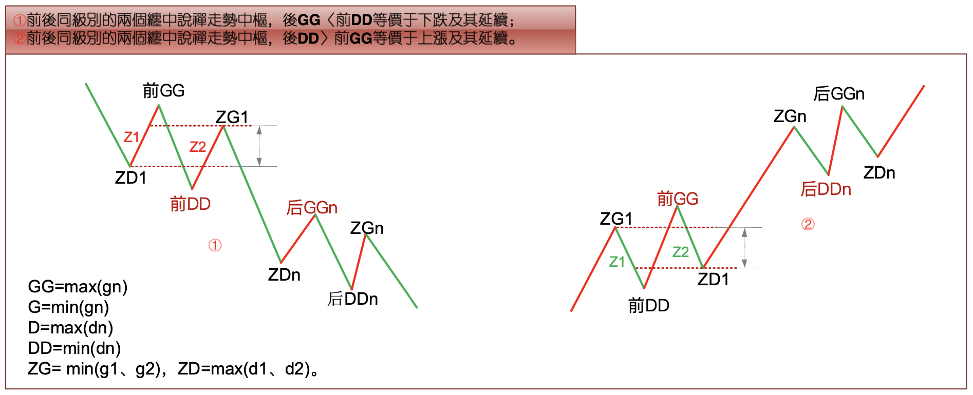 For convenience, hereafter all these sub-level trend types consistent with the hub's direction will be called Z-segments, recorded in chronological order within the hub as Zn, etc., with their respective high and low points recorded as gn and dn. Define four indicators: GG=max(gn), G=min(gn), D=max(dn), DD=min(dn), where n traverses all Zn in the hub. Specifically, further define ZG=min(g1, g2), ZD=max(d1, d2). Obviously, [ZD, ZG] is the zone of the Chan Theory trend hub, from which the following theorems emerge: