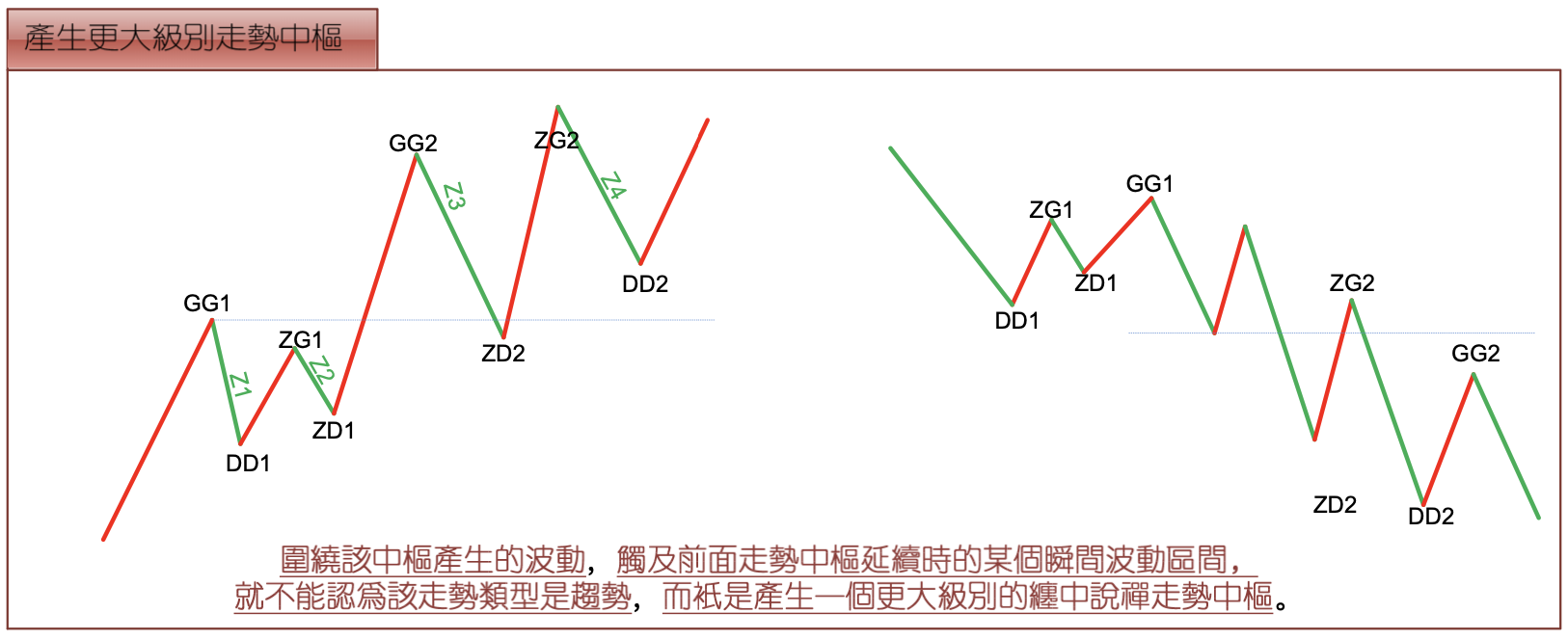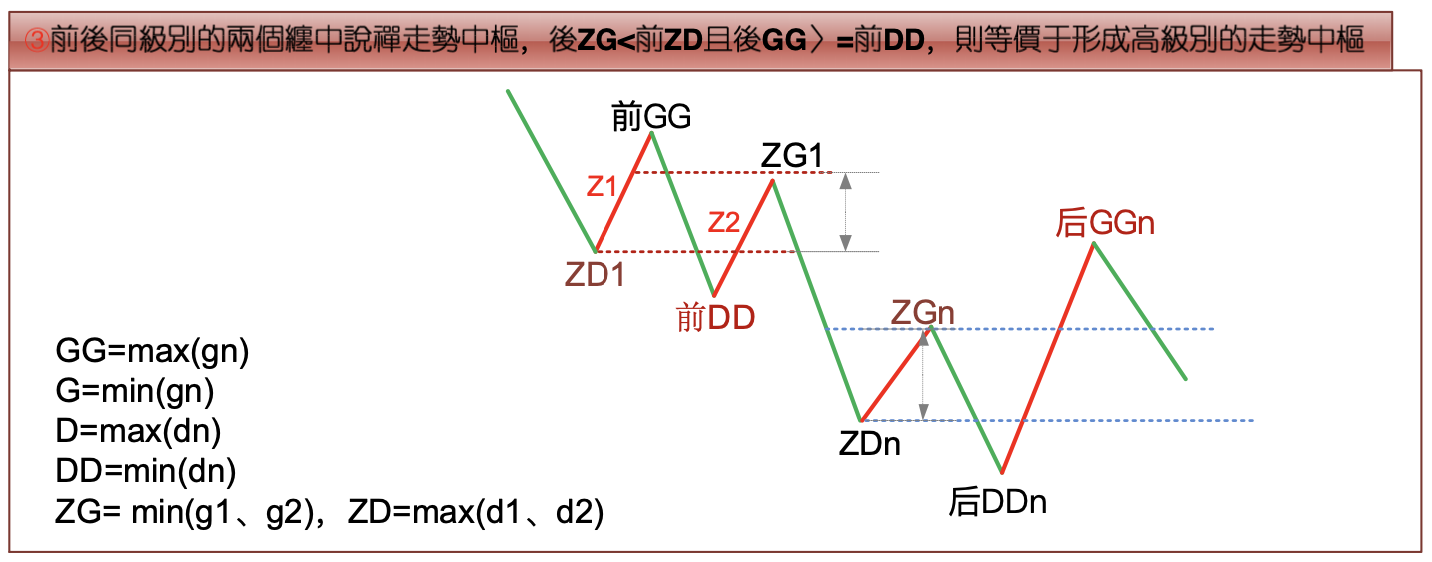 Chan Theory Trend Hub Central Theorem 2: For two same-level Chan Theory trend hubs front and rear: rear GG<front DD is equivalent to a downtrend and its continuation; rear DD>front GG is equivalent to an uptrend and its continuation. Rear ZG<front ZD and rear GG>=front DD, or rear ZD>front ZG and rear DD=<front GG, is equivalent to the formation of a higher-level trend hub.
