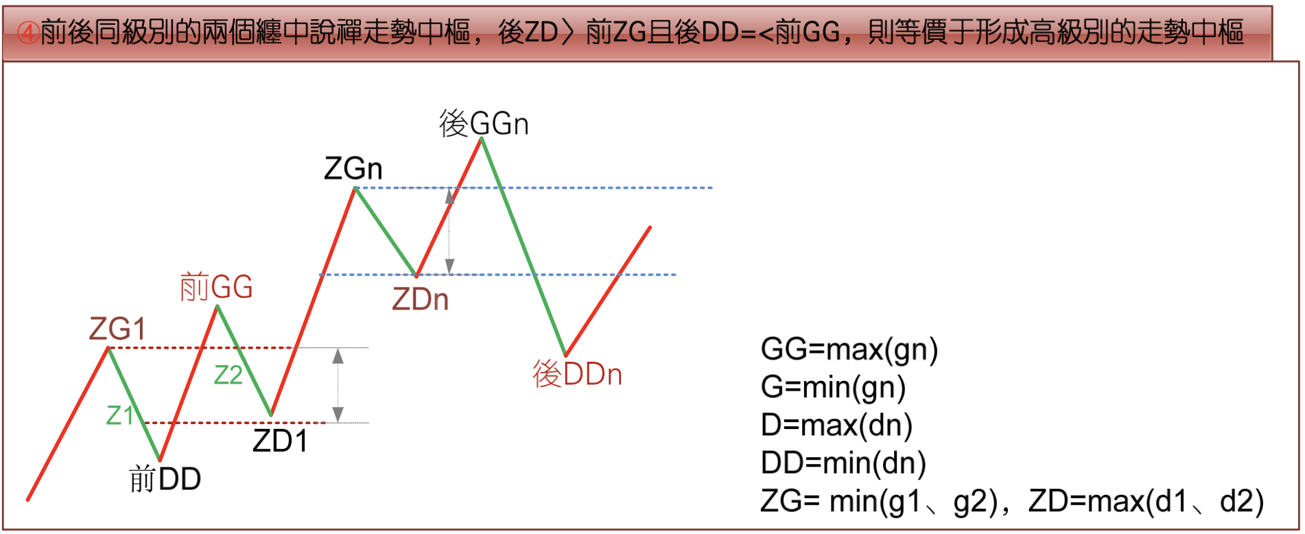 May I ask Miss Chan: in this passage — "For convenience, hereafter all these sub-level trend types consistent with the hub's direction will be called Z-segments, recorded in chronological order within the hub as Zn, etc., with their respective high and low points recorded as gn and dn. Define four indicators: GG=max(gn), G=min(gn), D=max(dn), DD=min(dn), where n traverses all Zn in the hub. Specifically, further define ZG=min(g1, g2), ZD=max(d1, d2)" — what do GG=max(gn), G=min(gn), D=max(dn), DD=min(dn) mean, and what indicators do they represent?