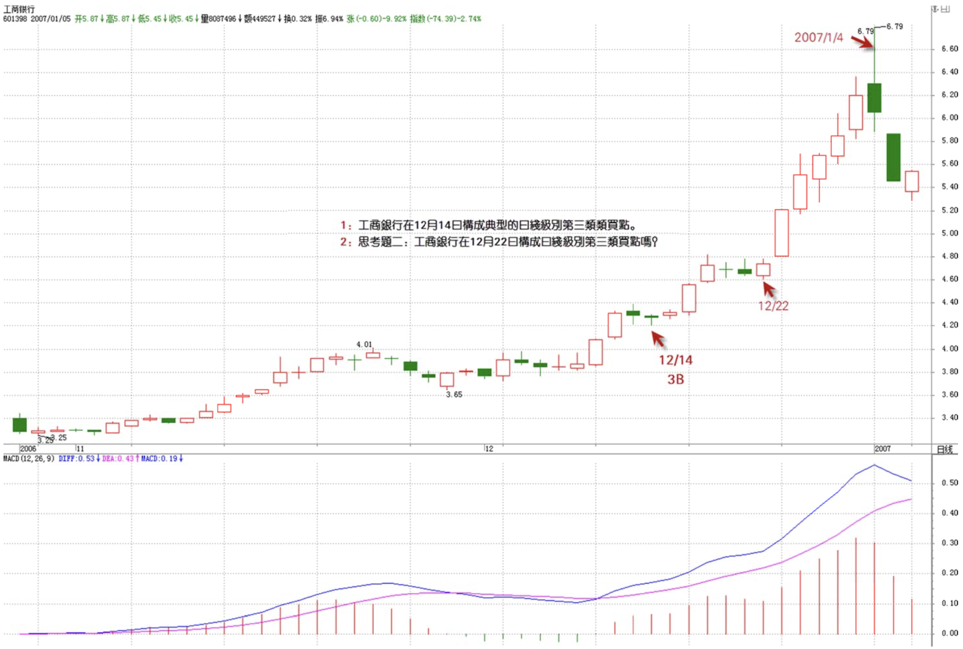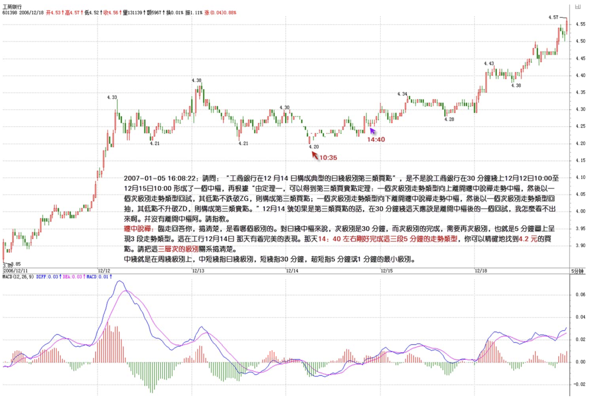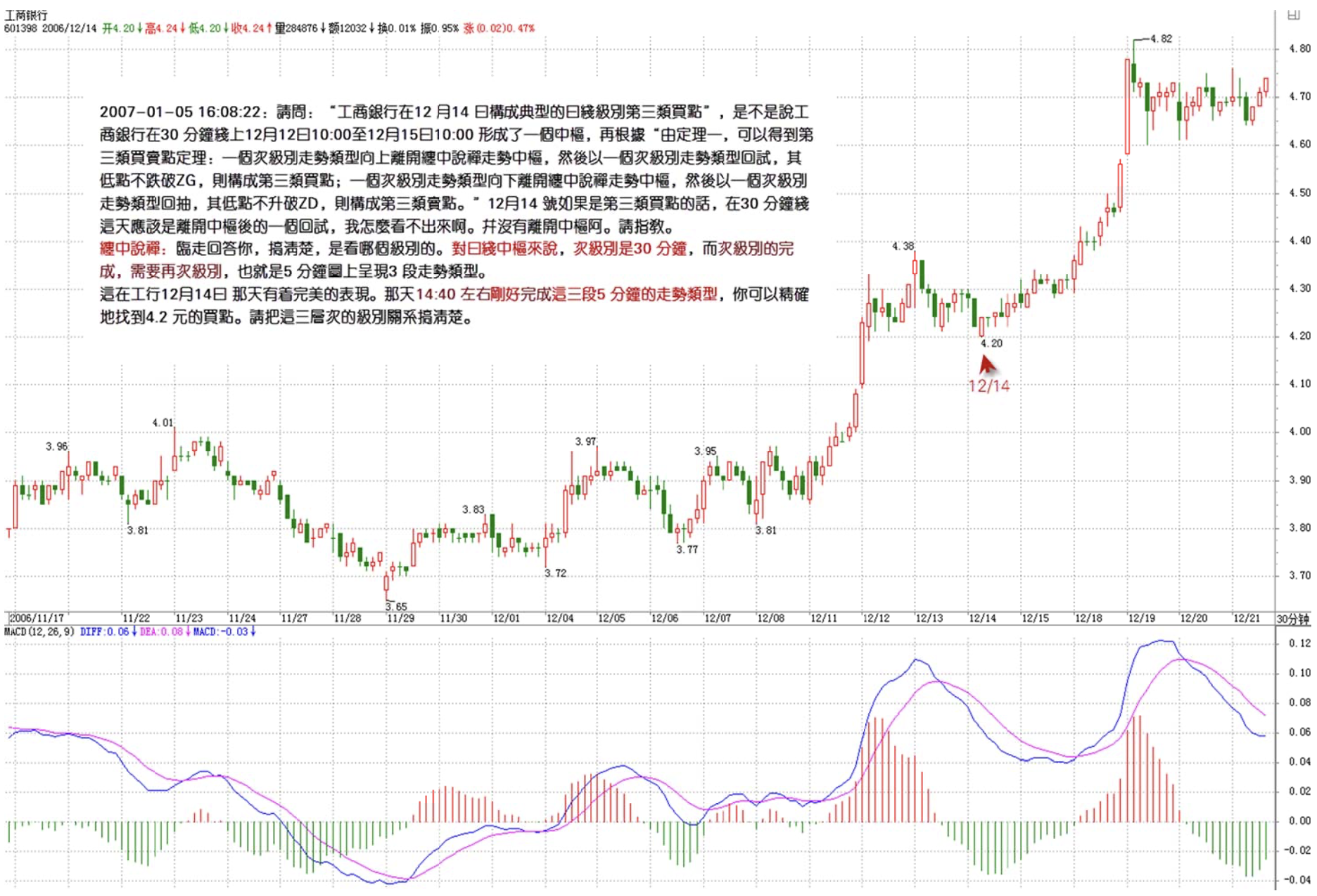 May I ask Miss Chan: "ICBC formed a classic daily-level third-type buy point on December 14th" — does this mean that on the 30-minute chart, ICBC formed a hub from 12/12 10:00 to 12/15 10:00, and then based on "From Theorem 1, we can derive the third-type buy/sell point theorem: if a sub-level trend type moves upward away from a Chán Zhōng Shuō Chán trend hub, then pulls back with a sub-level trend type whose low doesn't break below ZG, that constitutes a third-type buy point; if a sub-level trend type moves downward away from a Chán Zhōng Shuō Chán trend hub, then bounces back with a sub-level trend type whose high doesn't break above ZD, that constitutes a third-type sell point." If 12/14 was a third-type buy point, then on the 30-minute chart that day should show a pullback after departing the hub — but I can't see it. It doesn't seem to have departed the hub at all. Please enlighten me, Miss Chan.
