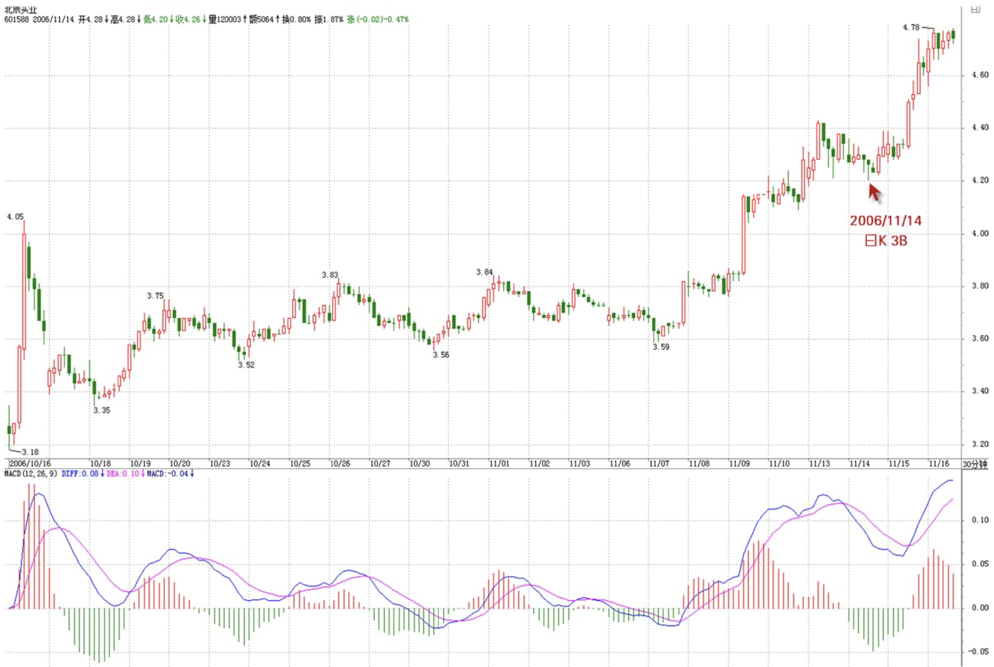 For example, ICBC formed a classic daily-level third-type buy point on December 14; Beijing North Star formed a classic daily-level third-type buy point on November 14; 000803 formed a classic daily-level third-type sell point on January 20. Note that the third type of buy/sell points are more delayed than the first and second types, but if caught well, they often save the time wasted in consolidation and are more suitable for funds with strong short-term skills. However, it must be noted that not every pullback or rally constitutes a third-type buy/sell point — it must be the first time. Furthermore, after a third-type buy/sell point, a trend does not necessarily follow — there's also the possibility of entering a larger-level consolidation. But the reason such trades necessarily profit is that even in consolidation, there will be high points. The operating strategy is very simple: once a trend fails to materialize, one must sell at the consolidation's high point — this is the same strategy as for first and second-type buy points.