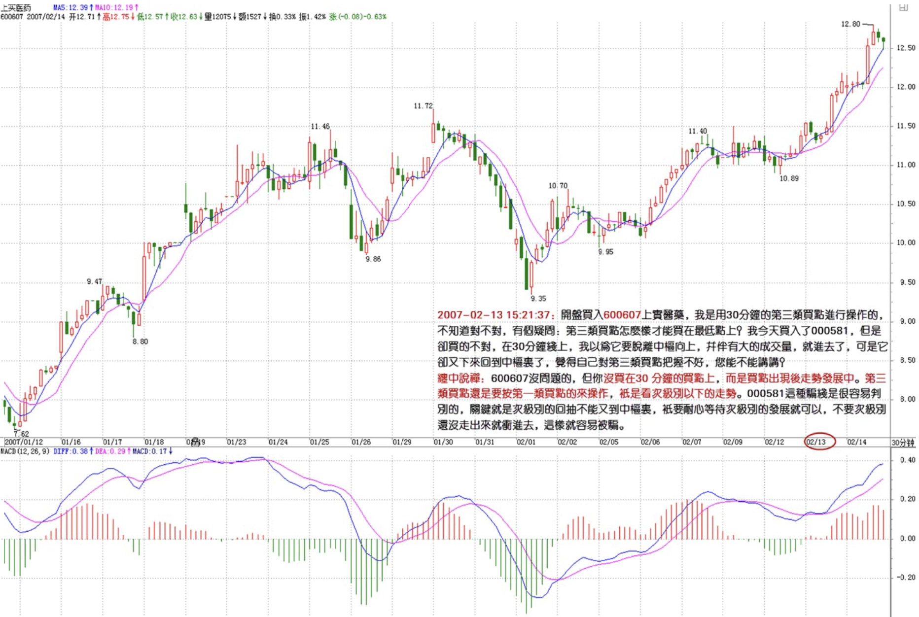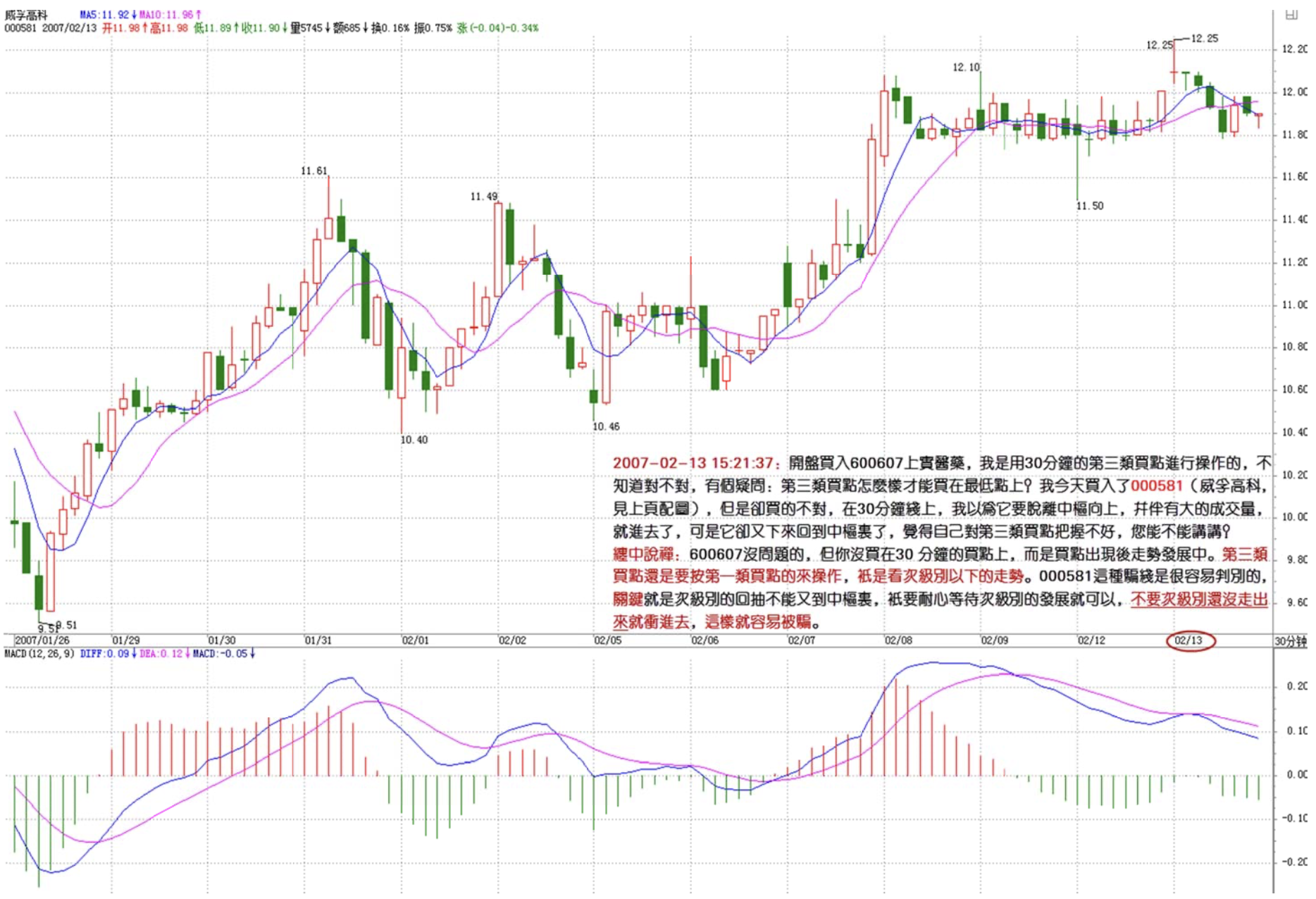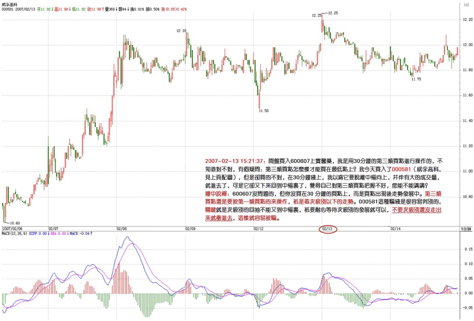 At the open I bought 600607 Shanghai Shiyao. Chan sister, I was using the 30-minute No. 3 buy point to trade — is that right? But I have a question: how can you buy at the absolute lowest with a No. 3 buy point? I also bought 000581 today, but that didn't go right. On the 30-minute chart, I thought it was breaking away from the hub upward with heavy volume, so I entered. But it came back down into the hub. I feel I'm not handling No. 3 buy points well — Chan sister, could you explain more?