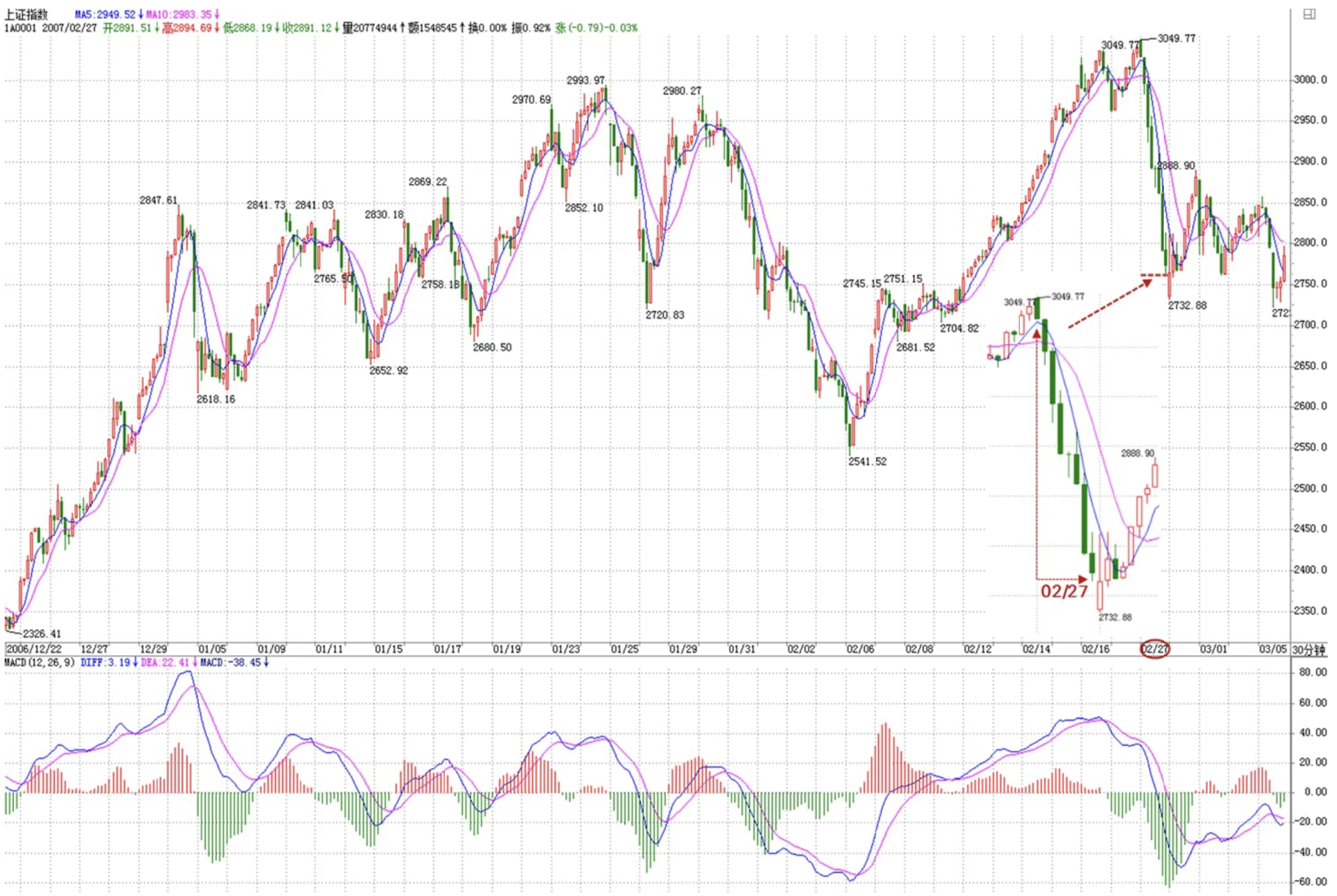 This is the strongest unilateral movement. Among 8 K-lines, no 3 adjacent ones have overlapping portions. Once this occurs, it's a typical violent movement, and that day's K-line carries significant importance. Generally speaking, this kind of movement is very uncommon. For example, the February 27th movement was one. But don't think such a movement necessarily means the trend will continue — many false signals deliberately use this type of movement, especially when it occurs within a large daily-level hub, where false signals are even more likely. For example, February 27th. However, if this type of movement appears after a third-type buy or sell point, the probability of a major strong trend at a larger level is extremely high.