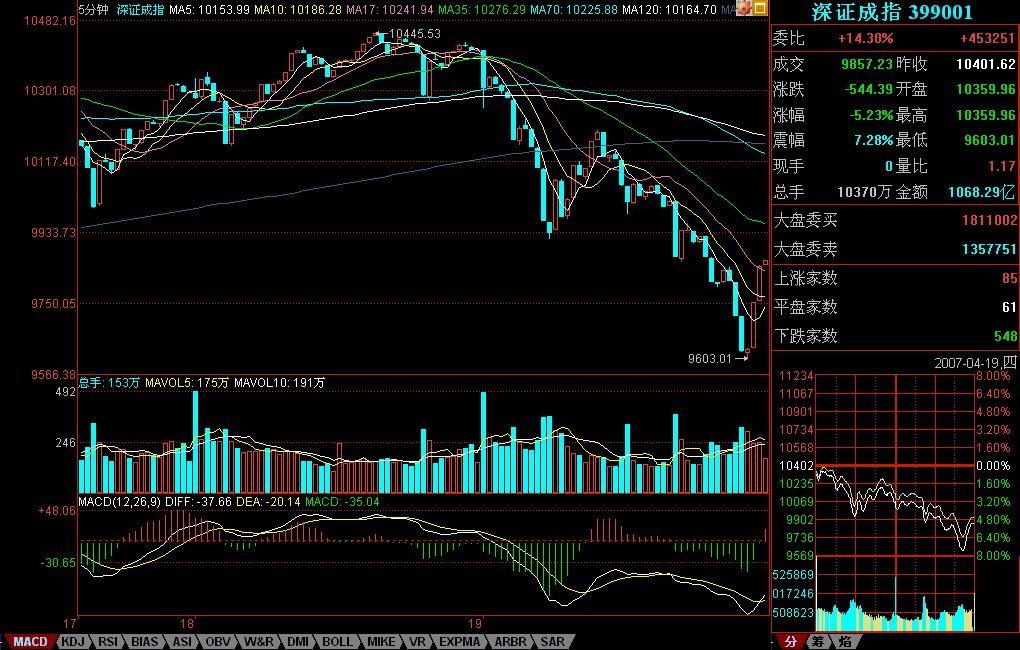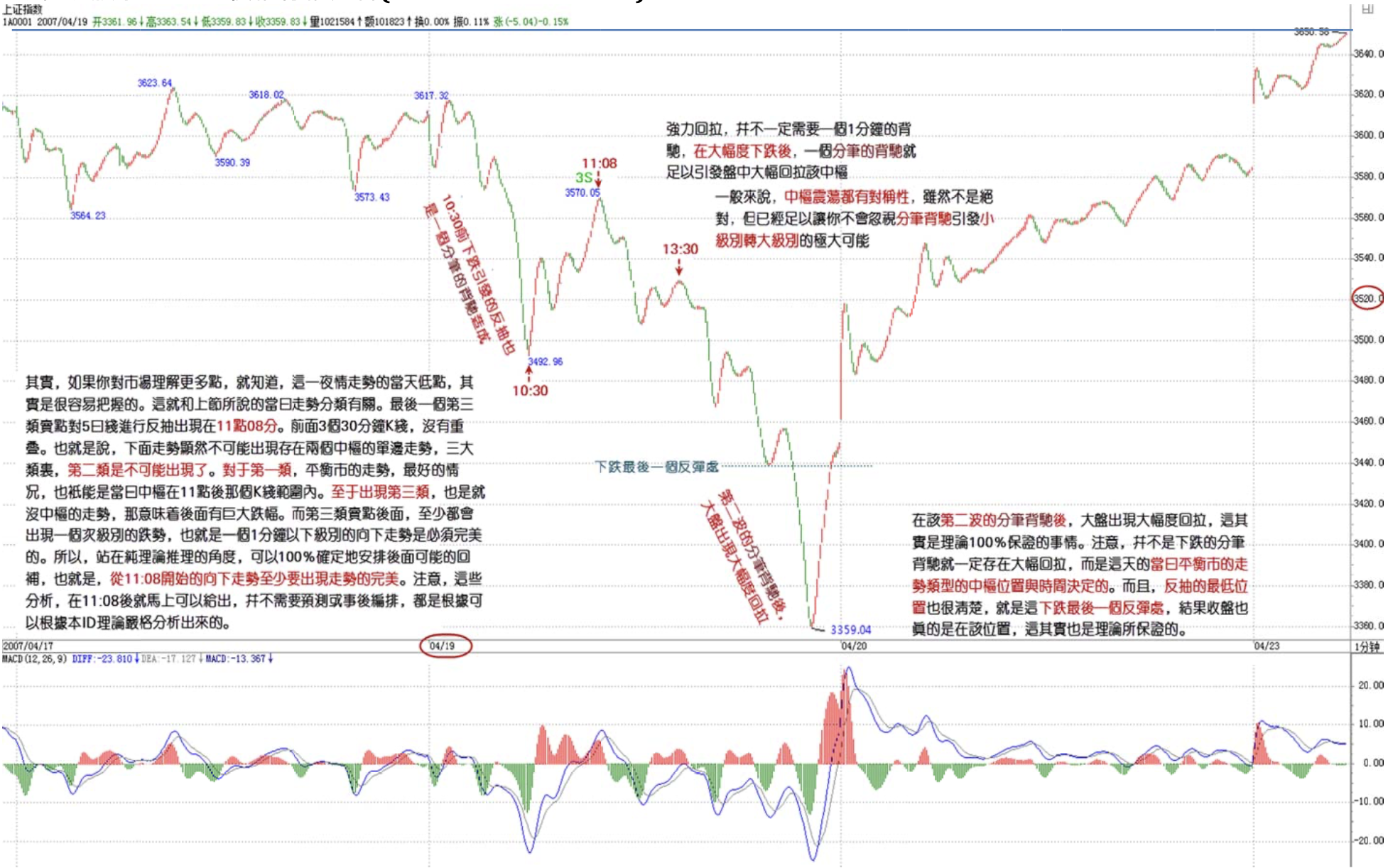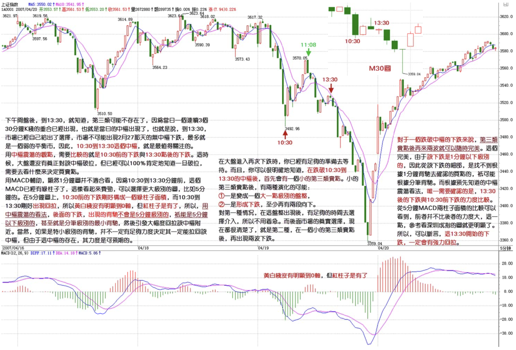 A very obvious principle: the more you understand the market, the more precisely you can grasp movements. For example, in yesterday's (2007/04/19) one-night stand market of 2007, after breaking below the 5-day moving average, there was a retest that at exactly 11:08 constituted a third-type sell point against the previous day's hub — this was the last, theoretically guaranteed escape opportunity. After that point, everything that followed had nothing to do with this ID's theory. In a decline, every sell other than at the very last position is correct, but that has nothing to do with this ID's theory — it's essentially gambling, betting that it's not the last position. Of course, gambling is also a method, but that kind of grasp is not within the scope of this ID's discussion.