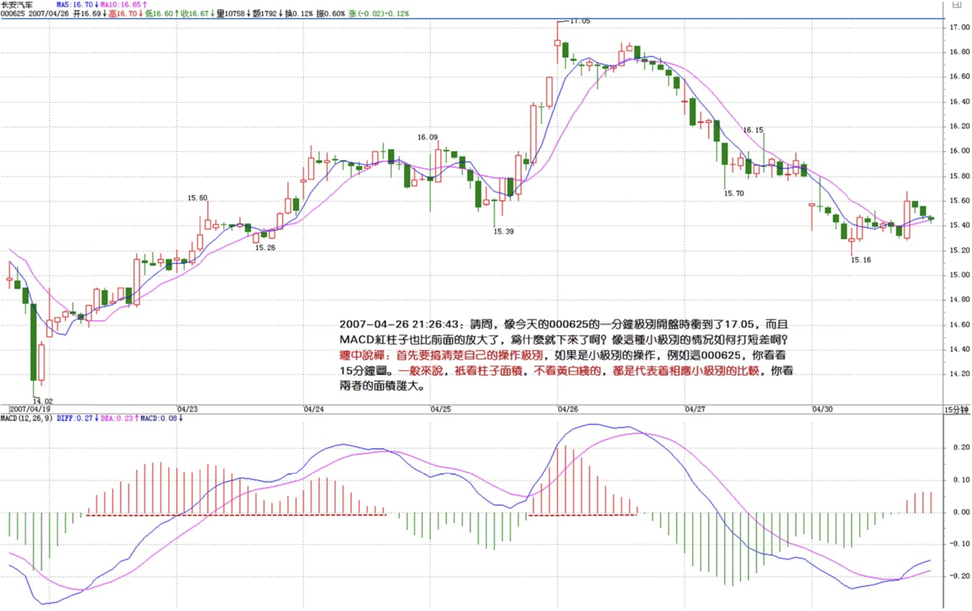 Thank you, blogger! Today's lesson was great! It's fairly close to actual operations and easier to understand. May I ask the blogger: like today's 000625 at the 1-minute level, the opening surge reached 17.05, and the red bars were also larger than before — why did it come back down? How do you play short-term differentials in this kind of small-level situation? I hope the blogger can answer. This situation seems very common!