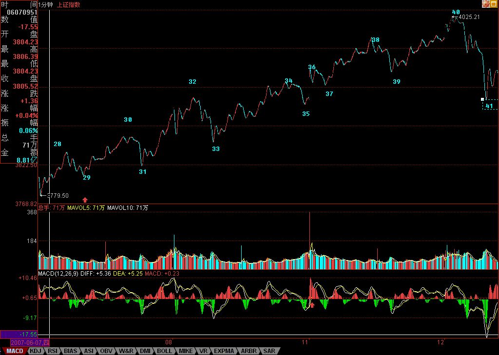 Note that in the previous lesson's 7-8-9, since 8's low point of 3994.57 and 7's last high point of 3994.21 are extremely close — if precision is only to the ones digit, the two are completely identical — so in such cases they can be considered overlapping, thus divisible into three line segments. Of course, if precision is required to two decimal places, then 7-8-9 could actually be considered a single line segment. Generally speaking, when the two are this close, and since 8 also shows clear down-up-down movement, it's better to treat them as three line segments. However, how you view it depends on the precision you predetermined — the key is to apply it consistently. Regardless of which precision you use, there's no substantive impact.