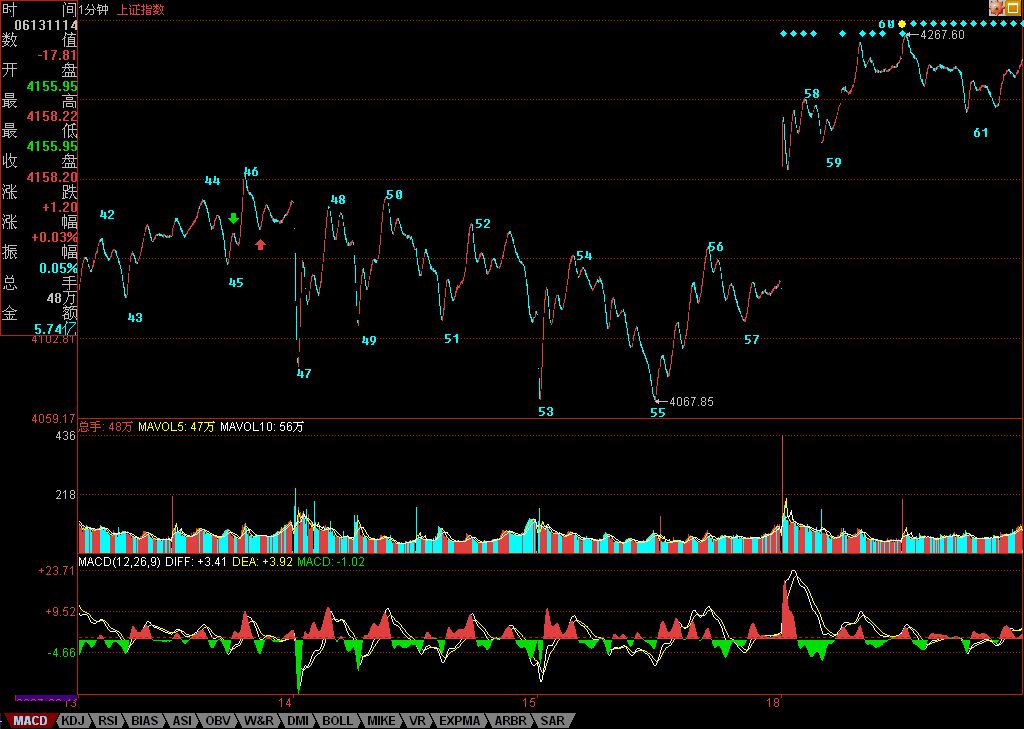 Today's movement was already described very clearly yesterday: no third-type sell point below 4224, and it's a strong oscillation. Today's movement clearly meets this requirement. 4224 points corresponds to position 61 on the chart above. Starting from 60, the 1-minute hub [4224, 4254] — the next two days are about watching for this hub's third-type buy or sell point. In other words, same as yesterday: as long as no 1-minute level third-type sell point appears below 4224, then it's strong. For the market to launch a new offensive, a 1-minute level third-type buy point must appear above 4254. Otherwise, the market will continue oscillating within this range as extended hub oscillation.