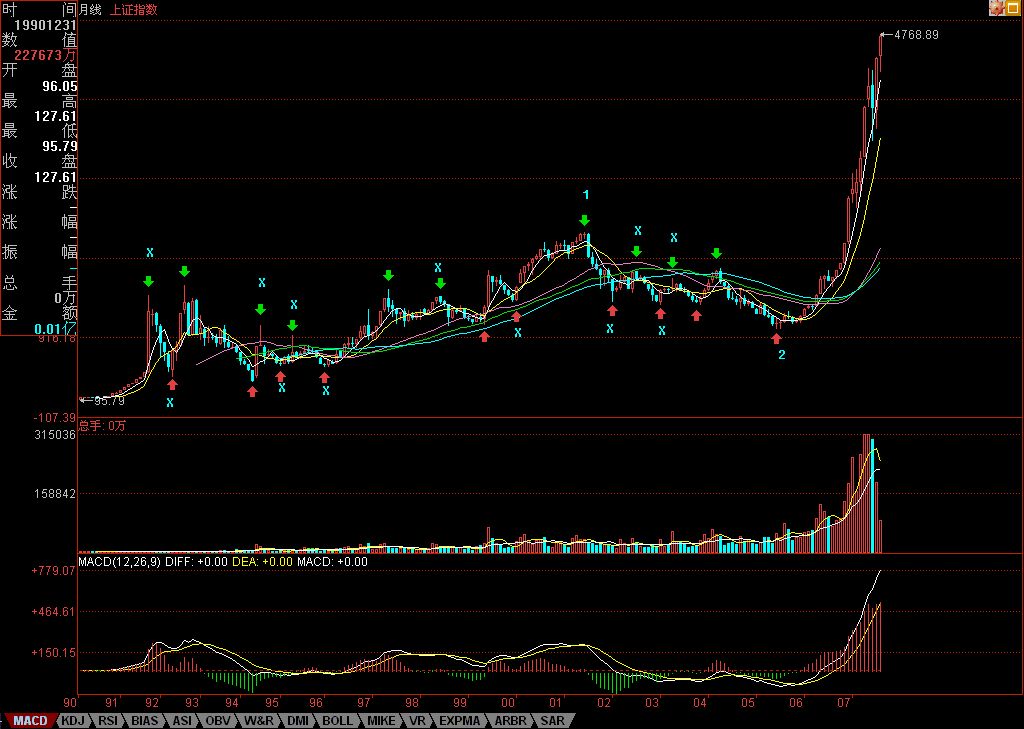 Below is the monthly chart of the Shanghai Index. Green arrows point to top fractals, and red arrows point to bottom fractals. Those marked with "X" indicate that the fractal doesn't meet the specifications required for strokes. Here, there are only two criteria: first, there isn't at least one candlestick between the top and bottom; second, it doesn't satisfy the requirement that a top must be followed by a bottom, or a bottom must be followed by a top.