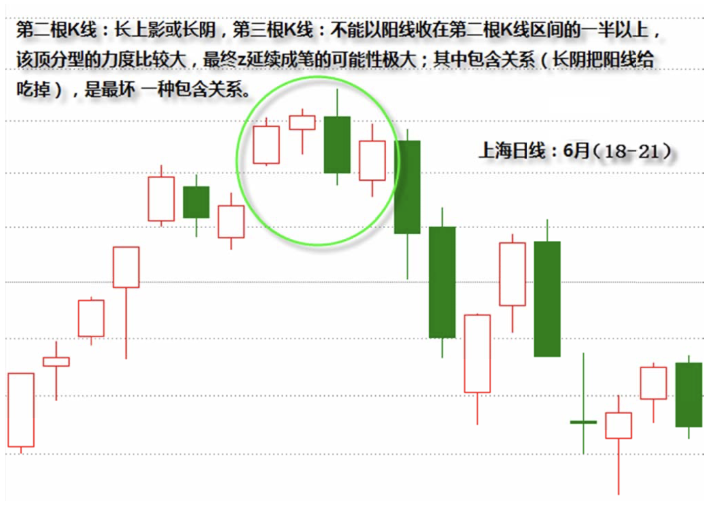 However, if the second K-line has a long upper shadow or is directly a long bearish candle, and the third K-line cannot close as a bullish candle above the midpoint of the second K-line's range, then the strength of this top fractal is relatively powerful, and the probability of it eventually extending into a stroke is extremely high. For example, the Shanghai daily chart on June 18, 19, 20, and 21 — which contains an inclusion relationship, but this inclusion is the worst kind, where a long bearish candle directly engulfs a bullish candle.