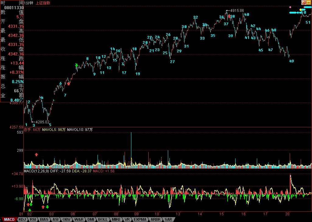 Returning to the Shanghai Index, from a purely technical perspective, the 8-49 range in the chart below can be viewed as a 30-minute hub, but it can also be seen as follows: for the 5-minute hub of 8-17, after the 1-minute trend of 17-38 showed a 5-minute divergence, a pull-back at least returning into the 5-minute hub of 8-17 was required. Obviously, 49 has broken below 14, perfectly demonstrating this ID's theory. From an ultra-short-term perspective, using the multi-interpretation nature of price action, the subsequent movement can first be viewed as an oscillation of the 5-minute hub of 32-41. For an upward breakout, a third-type buy point must appear; otherwise, despite today's 248-point rise, it remains merely a hub oscillation.