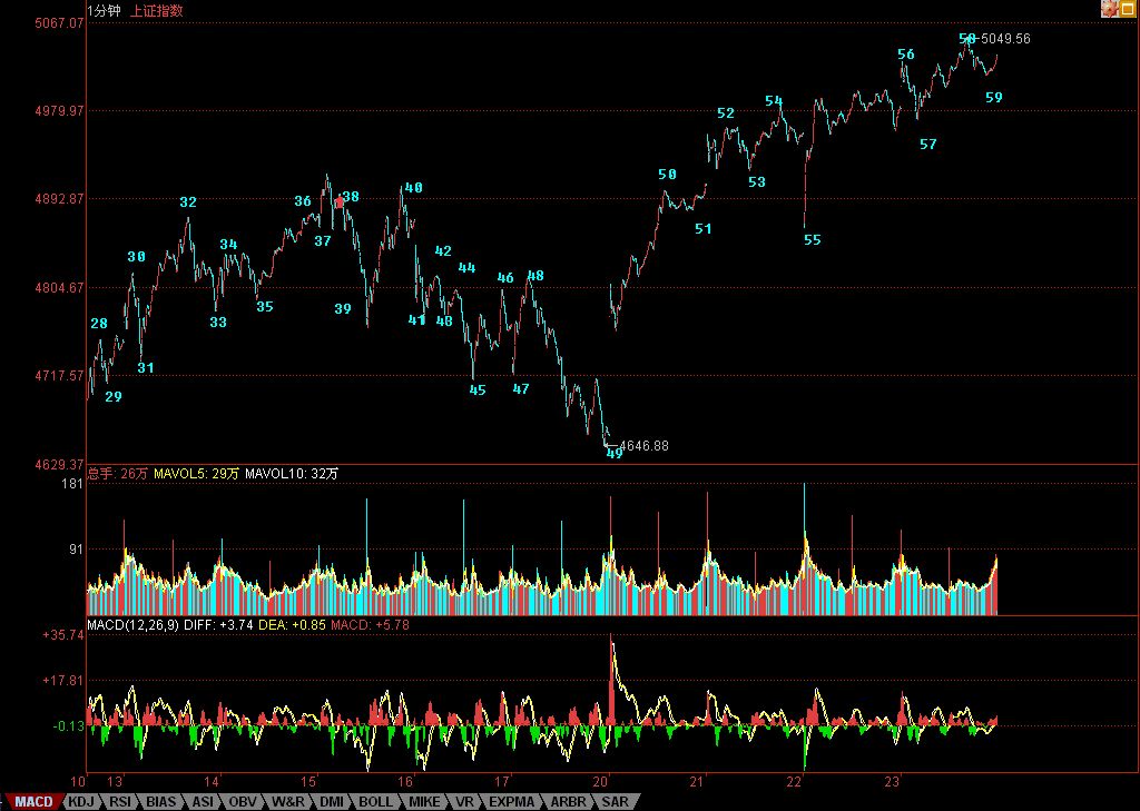 From a purely technical standpoint, once the 1/2 line is broken, you look at the 2/3 line, then the 3/4 line. But for now, let's first watch the 2/3 line. Judging from how the market broke through the previous lines, it didn't just touch and turn back, but rather oscillated around them. Since the distance between the 2/3 and 3/4 lines isn't large, the oscillation magnitude at these two lines won't likely be the same. Generally speaking, if it's a small-scale oscillation at the 2/3 line, then the 3/4 line will see a larger one. Therefore, how the market develops around the 2/3 line has certain significance for future market development. How to calculate the 2/3 line? 1429 + 183 × 30 × 2/3 = 5089. For the 3/4 line, just change the 2/3 to 3/4. Of course, when calculating next month, 183 needs to become 184, and so on.