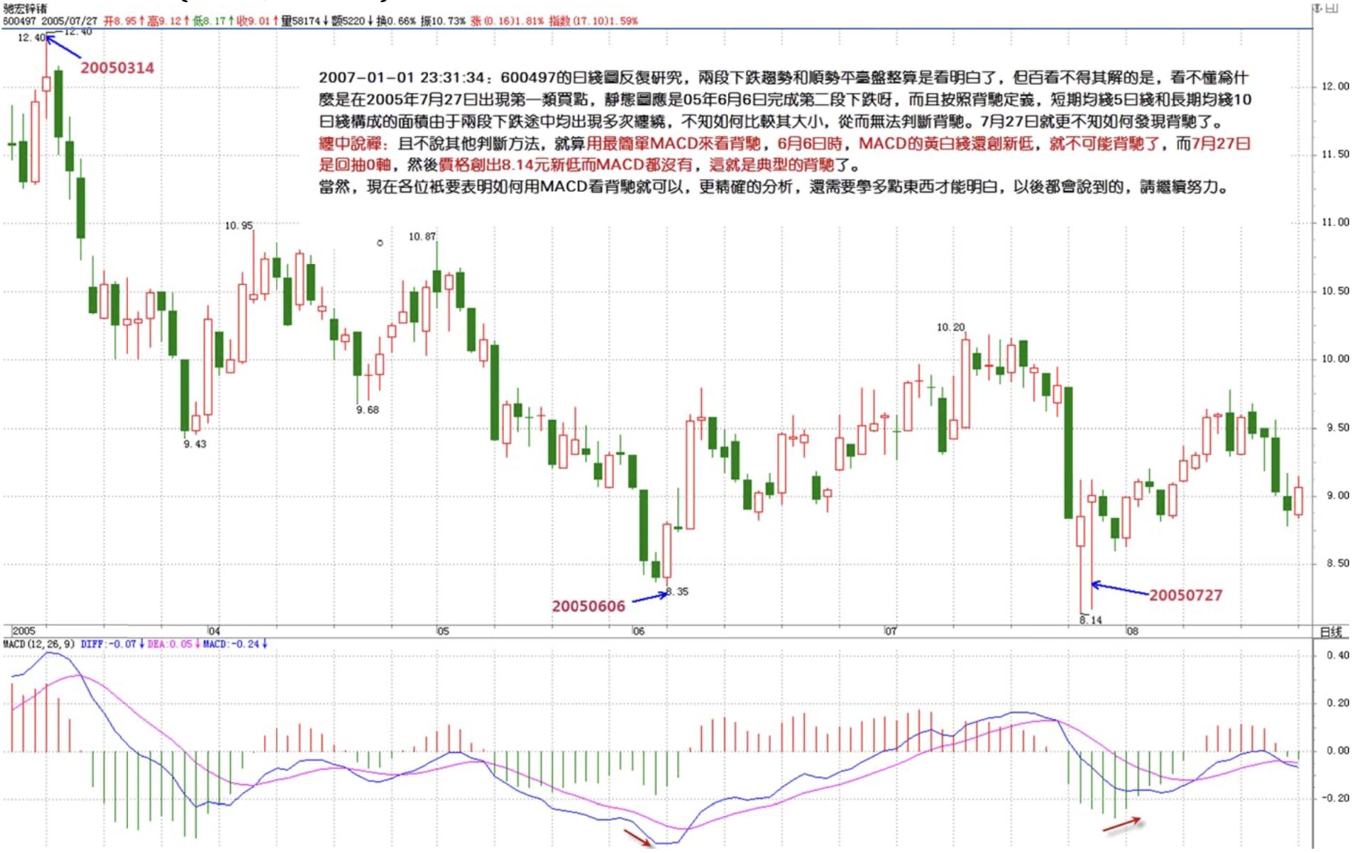 I've studied the daily chart of 600497 repeatedly. I think I understand the two downtrend segments and the horizontal consolidation platform, but what baffles me no matter how many times I look is: why does the first buy point appear on July 27, 2005? From the static chart, it appears the second downtrend segment was completed on June 6, 2005. Moreover, according to the divergence definition, the area formed by the short-term 5-day moving average and long-term 10-day moving average — since both downtrend segments had multiple entanglements along the way, I don't know how to compare their sizes, and thus can't determine divergence. As for July 27, I have even less idea how to identify divergence there. I'm slow-witted and sincerely hope for the OP's guidance.