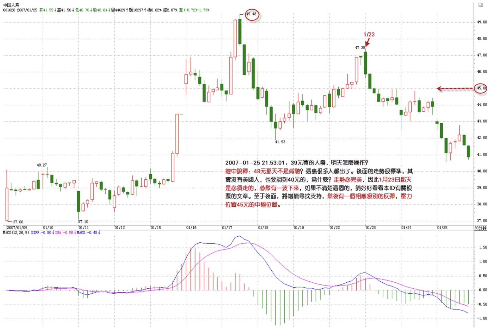 The 49 level wasn't divergence—many people here exited. The subsequent price action was very standard. Actually, even without the American, it would've had to pull back to 40. Why? Trends must complete themselves. So the January 23rd move was inevitable—there had to be one leg down. If you're unclear about this, please carefully read this ID's stock articles. As for what comes next, support will continue to be tested, followed by a rebound of the corresponding level, with 45's hub as the pressure level.