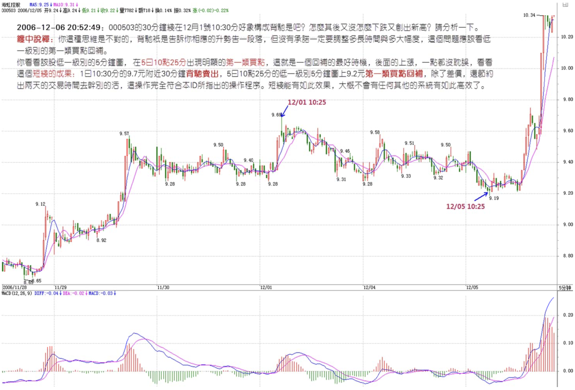 Sold near 9.7 yuan at the 30-minute divergence at 10:30 on the 1st; re-entered at the 9.2 yuan first-type buy point on the lower-level 5-minute chart at 10:25 on the 5th. Besides pocketing the price difference, you also freed up two trading days to do other things. This operation fully conforms to the trading procedure this ID has outlined.