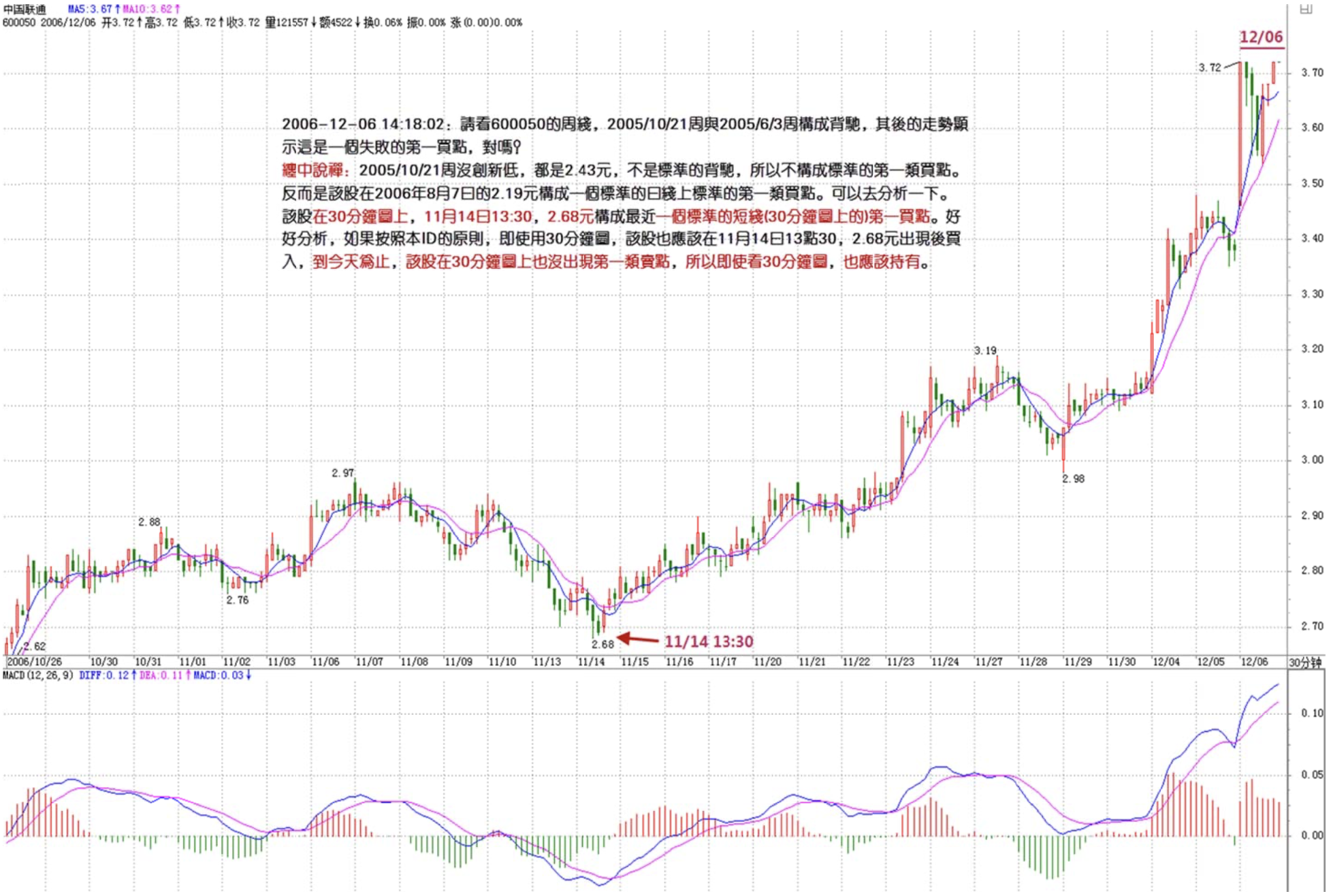 Study it carefully. If following this ID's principles, even using the 30-minute chart, one should have bought after the 2.68 yuan point appeared on November 14 at 13:30. Up to today, no first-type sell point has appeared on the stock's 30-minute chart, so even looking at the 30-minute chart, one should continue holding.