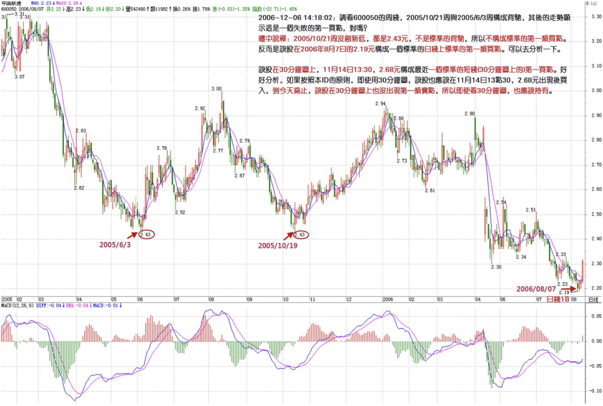 LZ, look at 600050's weekly chart. Does the week of 2005/10/21 form a divergence with the week of 2005/6/3? The subsequent price action shows this was a failed first buy point, correct?