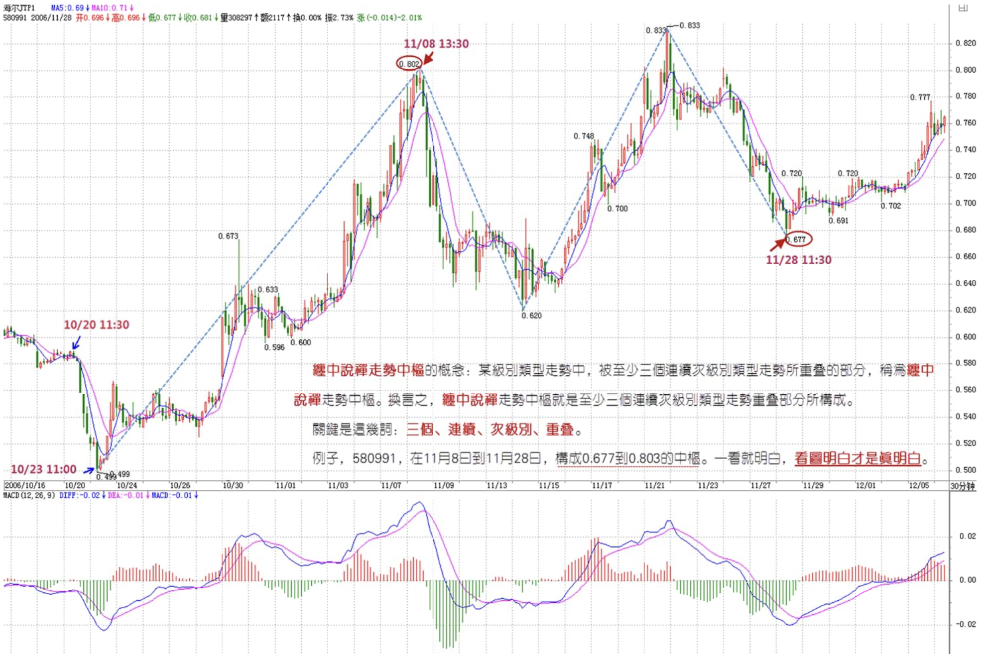 Sister Chan said on the 580991 daily chart, from June 2 to October 23, it doesn't form a complete decline+consolidation+decline. Only on the 30-minute chart does it. Then she said November 8 to November 28 is the overlap of three consecutive sub-level movement types, constituting a Chán Zhōng Shuō Chán movement hub — I understand that. But then the question is: what trend is October 23 to November 8? What's its relationship to this hub? And what trend is November 28 to today? Is it because there's only one hub that the entire movement from October 23 to today counts as consolidation? If the price keeps rising after tomorrow and forms a second hub, where does that second hub start? From November 28? Why doesn't October 23 to November 8 count as one of the three consecutive sub-level movements?