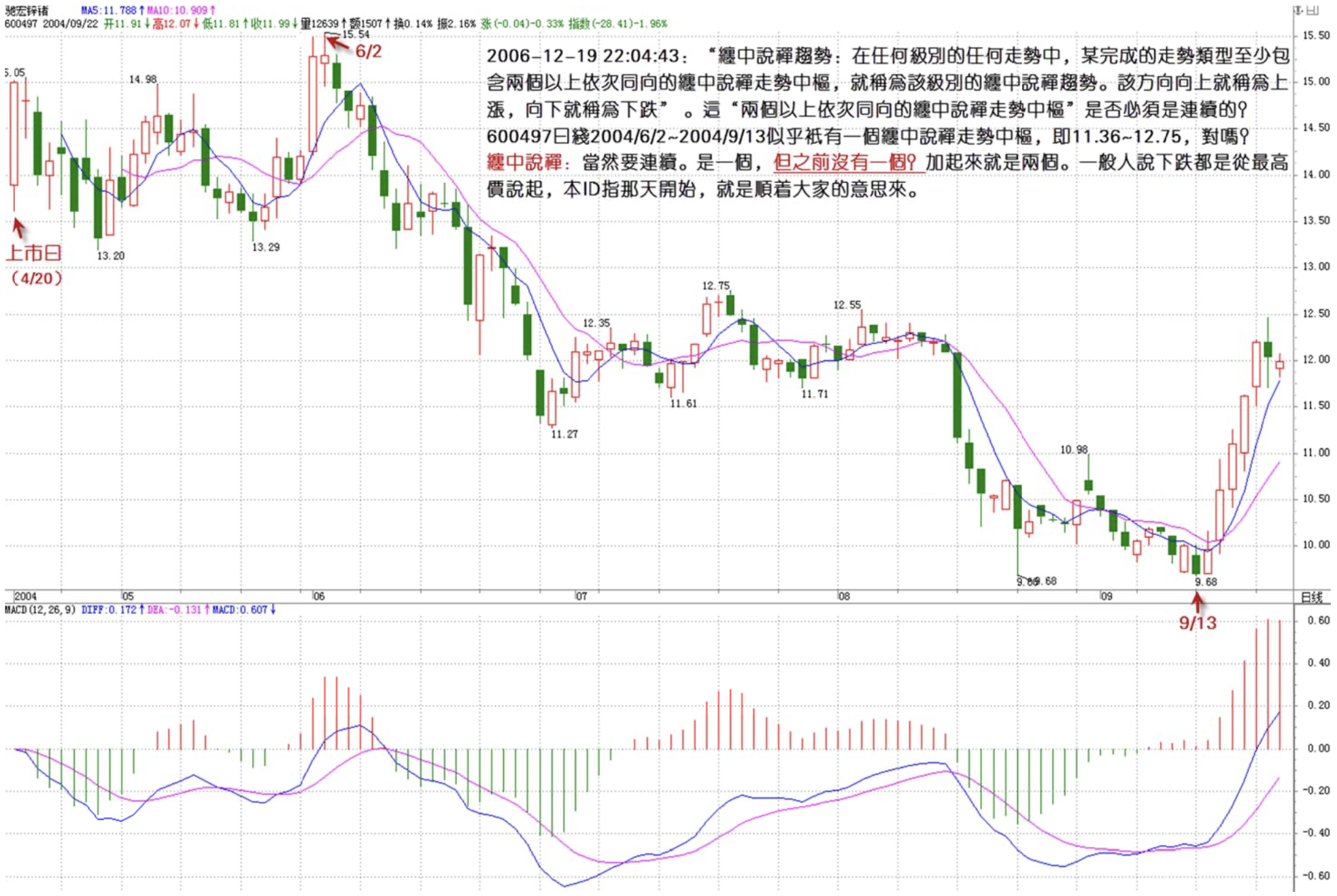 On 600497's daily chart from 2004/6/2 to 2004/9/13, there seems to be only one Chán Zhōng Shuō Chán movement hub, namely 11.36~12.75. Is that correct?