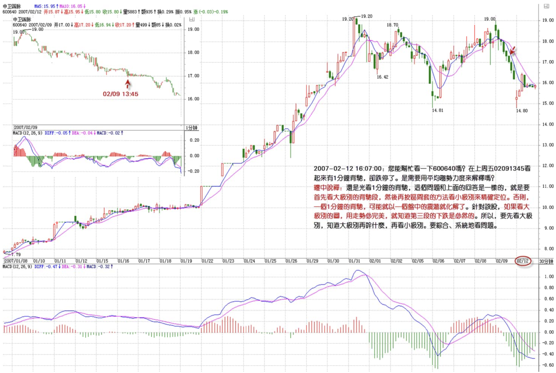 3. The original text states that using MACD to judge divergence requires two same-direction trend segments. Must the last two divergence segments of a large trend be trends? The two segments connecting before and after the last hub of a large trend can be sub-level or below movements — not necessarily trends. Is divergence still valid in this case?