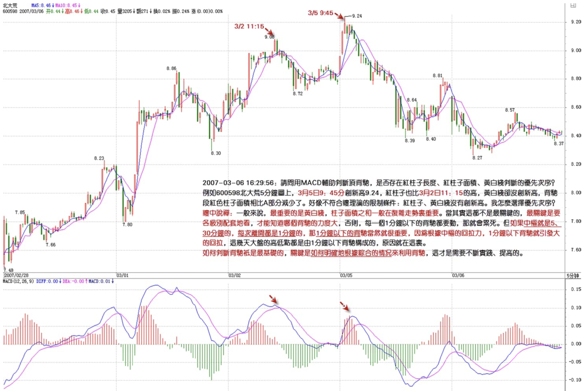 For example, looking at 600598 Beidahuang's 5-minute chart: on March 5 at 9:45, it made a new high at 9.24, red bars were also higher than March 2 at 11:15, but the yellow/white lines didn't make a new high. The area of red bars in the divergence segment decreased compared to the A section. It seems not to meet the Chan theory restriction: "red bars and yellow/white lines failing to make new highs."