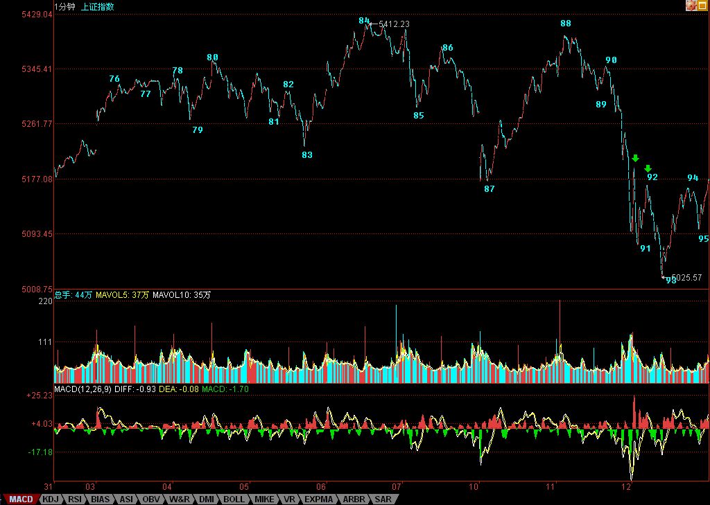 So what comes next? Simple: after the 84–93 1-minute trend type left the 76–85 5-minute hub, we need to watch whether a 1-minute trend type pullback can reach back above point 79, i.e., above 5265 points. If not, that constitutes the third-type sell point of this 5-minute hub, and subsequently it must at minimum expand into a 30-minute hub—worst case, a 5-minute level decline.