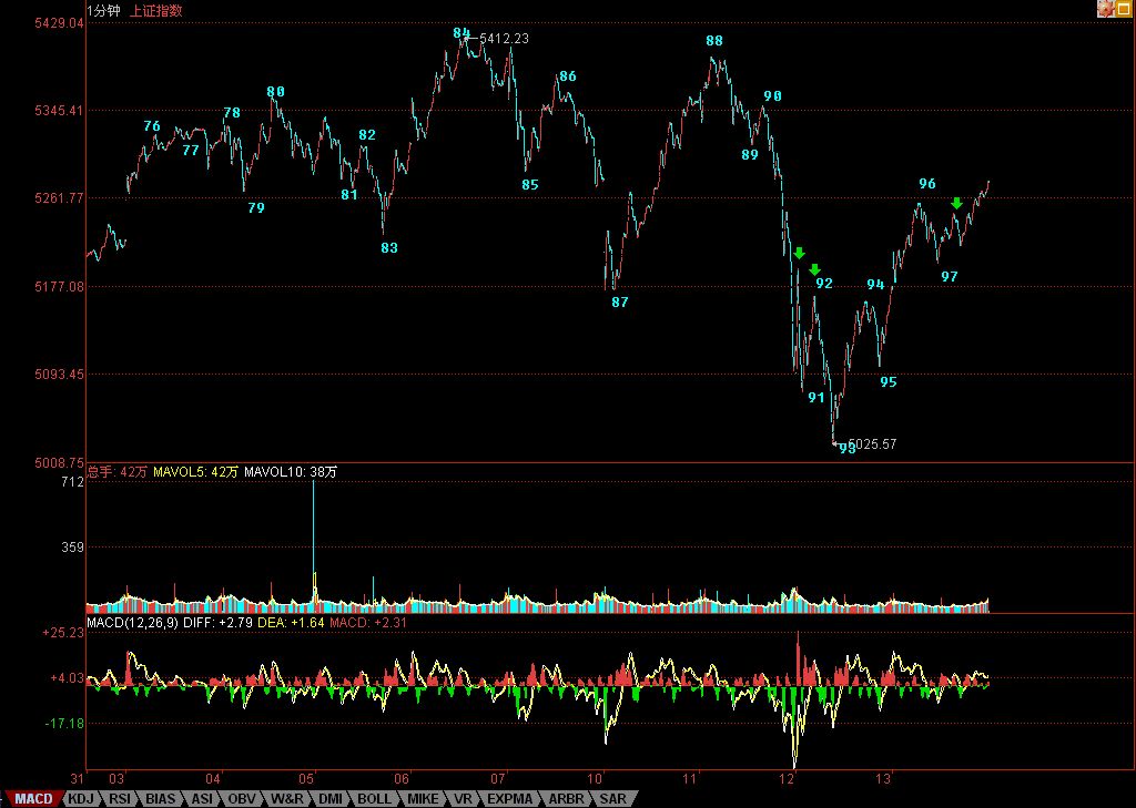 As for the other analyses, they remain valid. The 5-minute hub oscillation starting from point 76 hasn't formed a third-type sell point. The line-segment-level rally has already pierced through 5265 points, which is naturally even more powerful than a 1-minute trend type piercing through 5265 points.
