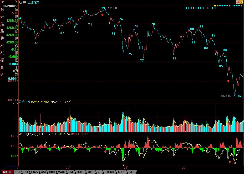 Since I need to travel, let me post this line segment chart first — otherwise, by the time I return, a huge pile of K-lines will have accumulated, requiring many charts. Yesterday's analysis was very clear: "Tomorrow is still about that 4244 point — stabilize above it and the market strengthens; otherwise, the 5-minute hub oscillation continues, and watch out for a third-type sell point." Today's trend was precisely suppressed again right at the 4244 point, followed by a sharp plunge — all of this was easy to analyze in real-time. The consolidation divergence at 81-82, the second-type sell point at 84, then a standard line segment decline, with divergence appearing before and after the micro hub indicated by the red arrow, leading to the turning point at 87. But this turning point, since 86-87 shows no divergence, can only be a sub-level of the line segment. Therefore, one cannot conclude now that this line segment is complete, unless point 85's 4131 is broken above again.