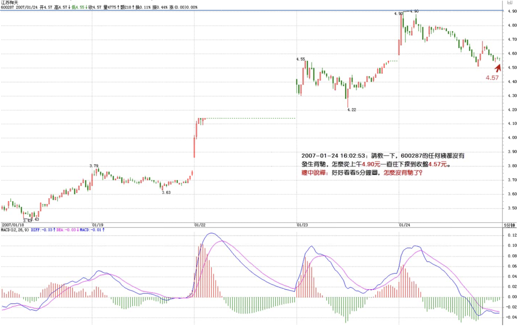Chán Jiě, may I ask — 600287 doesn't show divergence on any timeframe, so how did it drop from 4.90 this morning all the way down to close at 4.57? Thank you, Chán Jiě!!!